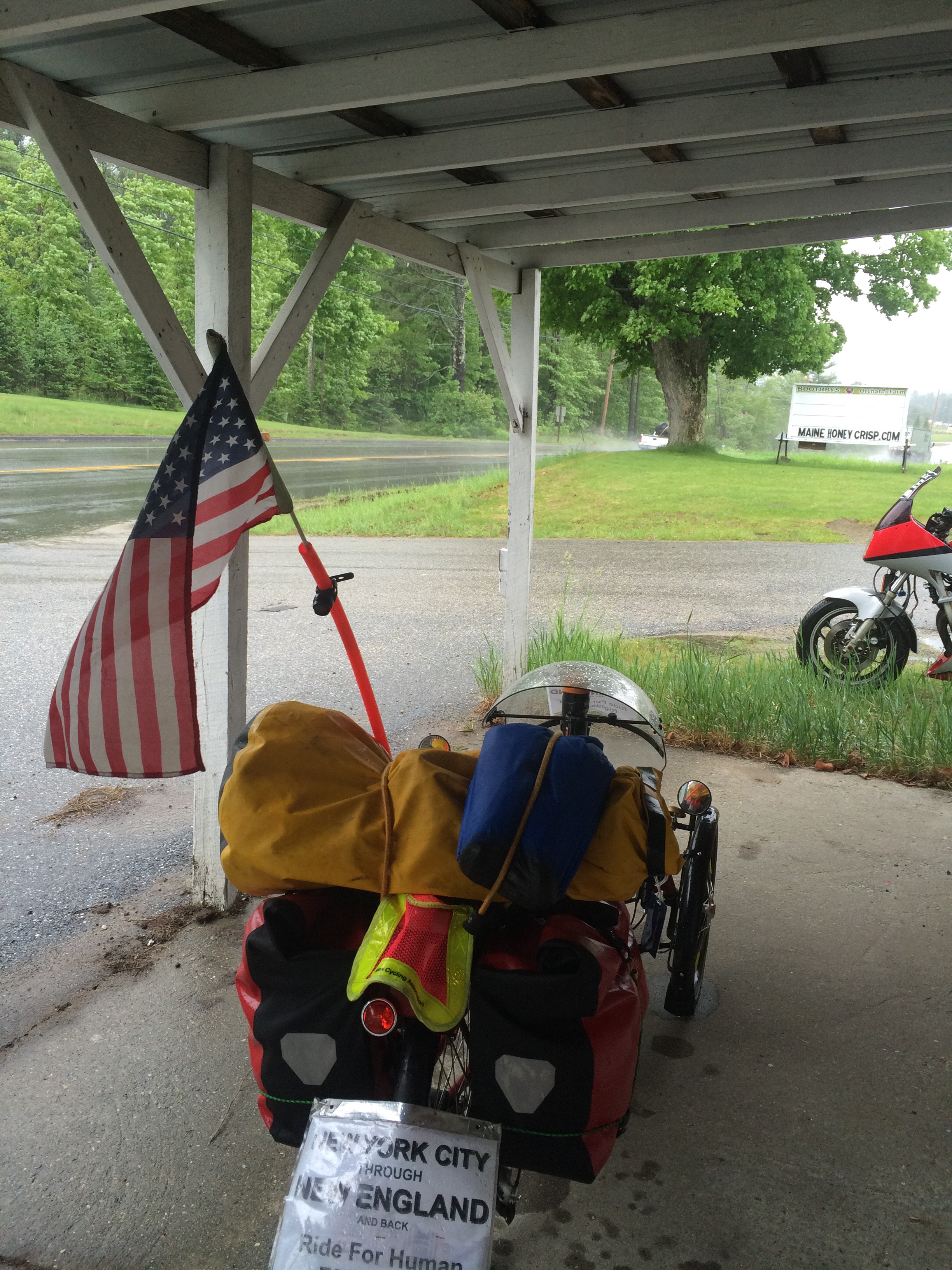 During a downpour, we took shelter at a closed farmstand.