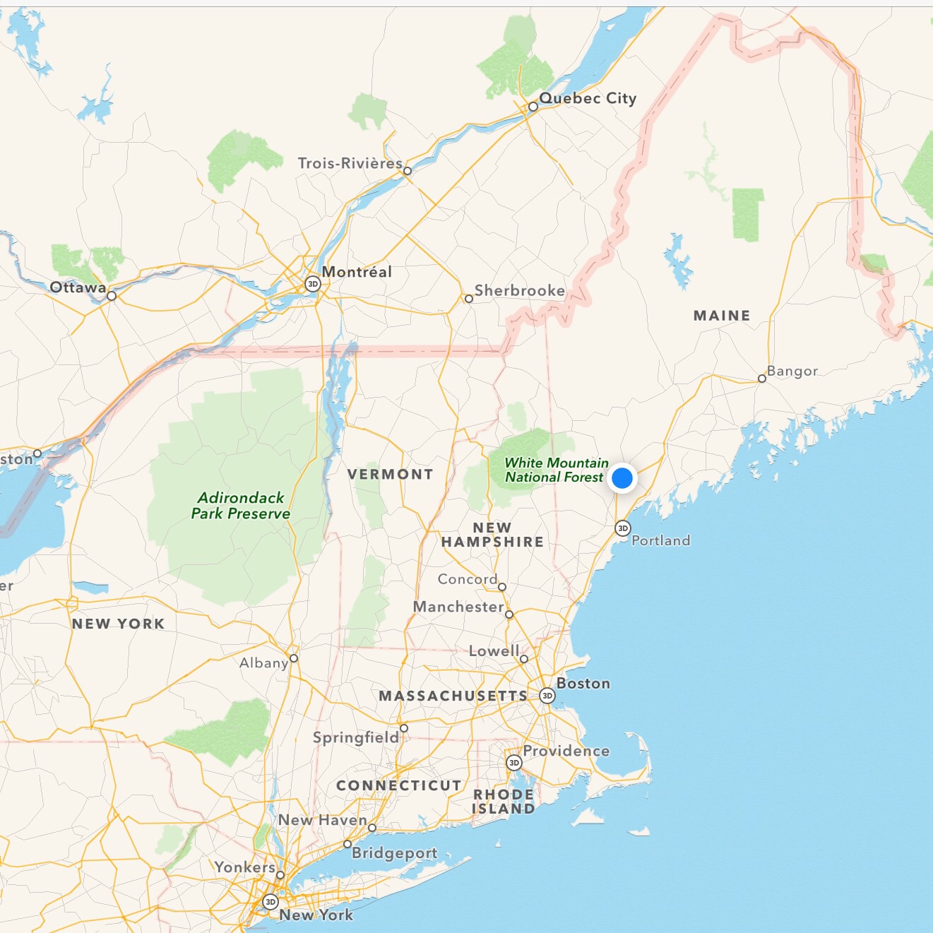 The blue dot marks where we are tonight, south of Jay, west of Wiscasset, with 515 miles (834 km) in the bank. We’ve started for home. We’ve a long way to go.