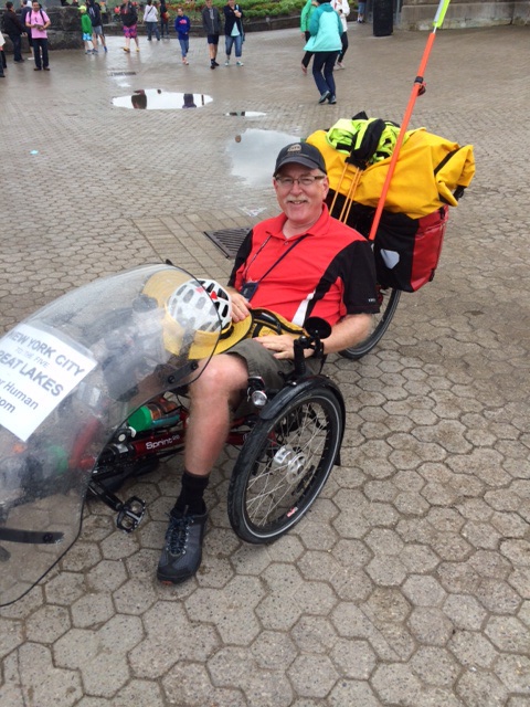This last photo was taken by Sofie, spouse of our new friend Knud. Their daughter and her boyfriend are under the green umbrella. Knud and Jeffrey are near the rail in the right middle of the photo (look for the trike’s yellow cargo bag) talking about tricycles (Knud built one) and human rights (Knud and Sofie help refugee children in Denmark). Knud tried out the trike and took Jeffrey’s photo too. Note that Jeffrey removed the U.S. flag from the trike; it is in poor taste to fly it when we are guests in Canada.