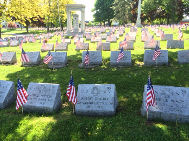 Spanish-American War veterans’ tombs in Buffalo. Now, there was a necessary war! (Not.) The tall stone monument marks this section of the cemetery.