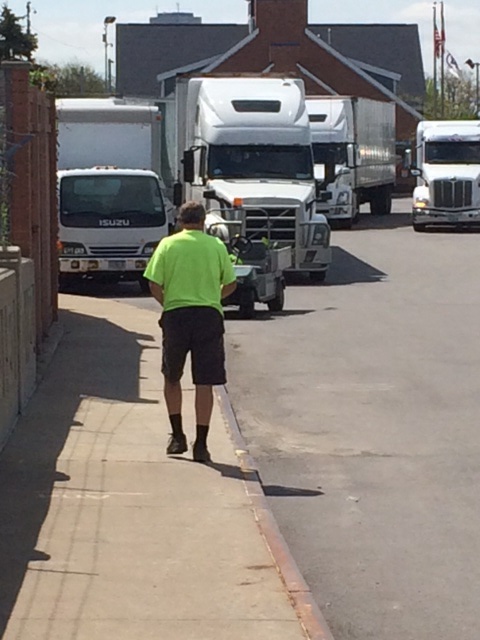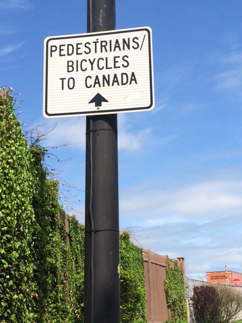 At the Peace Bridge, after failing to find the bike lane, we were accosted by Customs and Border Patrol officer Smith. Once Jeffrey explained our situation, Mr. Smith became friendly and helpfully directed us to leave the area and pass under the bridge to the south walkway. En route, a kind construction worker in fluorescent green stopped us by the “inoperative” sign you see here, returned with us to the area from which Office Smith sent us, put us onto the “closed” north walkway, and called ahead for his Canadian counterparts to expect us.