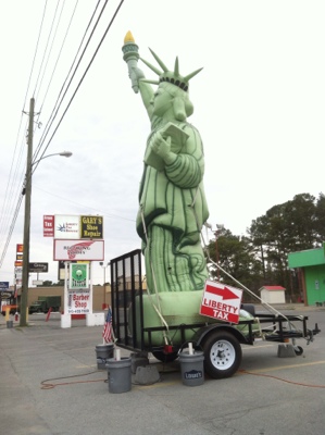 This Lady Liberty imitation is in the style of the giant rats inflated in NYC in front of establishments that have offended one of NYC’s labor unions. Liberty Tax: odd name, that. Taxes actually do buy liberty, and civilization, but it’s not fashionable to acknowledge it nowadays.