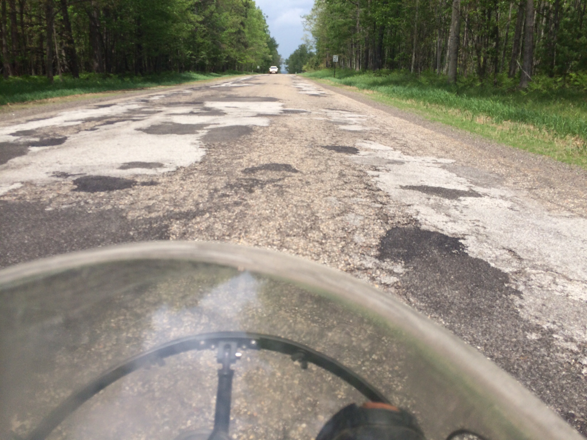 We continued to encounter bad stretches of road, and occasional smooth bits. Miles of road passed through woods with no houses and no cultivated fields.
