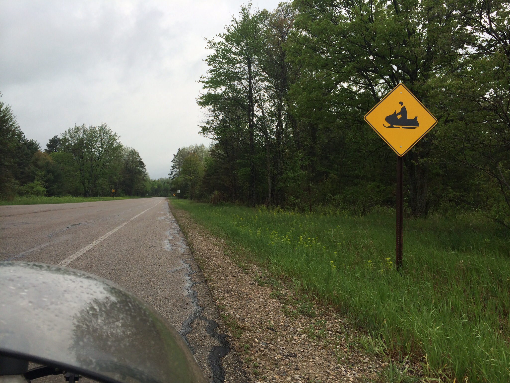 We kept going through drenching rains, lightning and thunder, past Otsego Lake and lush ponds, past a house in Arbutus Beach flying the Confederate battle flag, past a puzzling sign, past a hill that suggests what some of the few local hills are made of.
