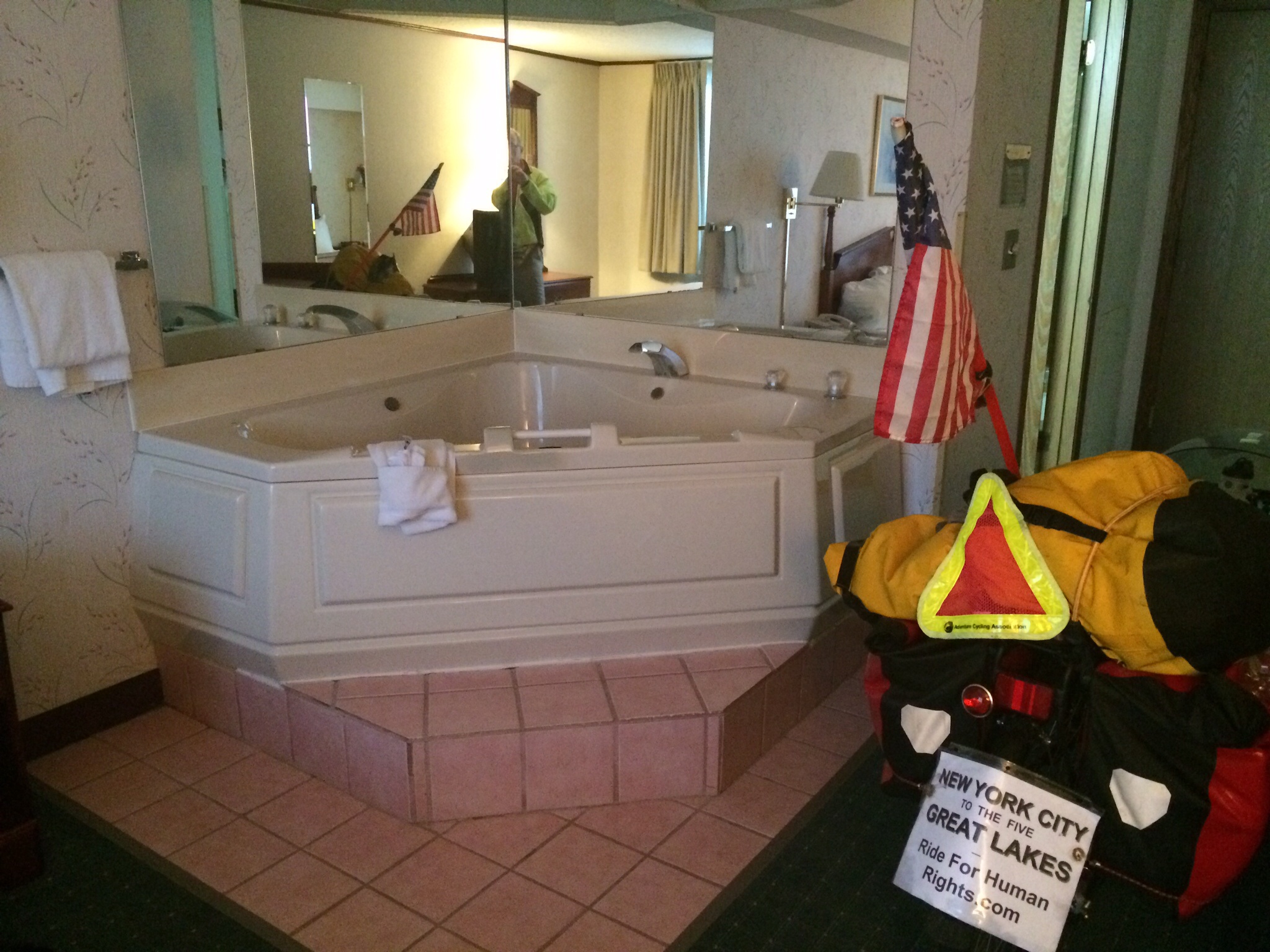 Barbara went on her way, and we proceeded to a motel where the clerks were so taken with the idea of the Ride, they gave us a room at half price, with a jacuzzi! The tub is wasted on Jeffrey who is such a peasant, and kangaroo puppets must avoid water. But what a kind gesture.