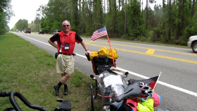 A blast from the past: This is the photo Jörg took of Jeffrey two days ago, just north of Yulee, FL. Nancy commanded Jeffrey to wear that thing around his neck, bearing Nancy’s contact info, in case the houn’ dawgs drag him off. Eager to please his one true love, Jeffrey hastened to obey.