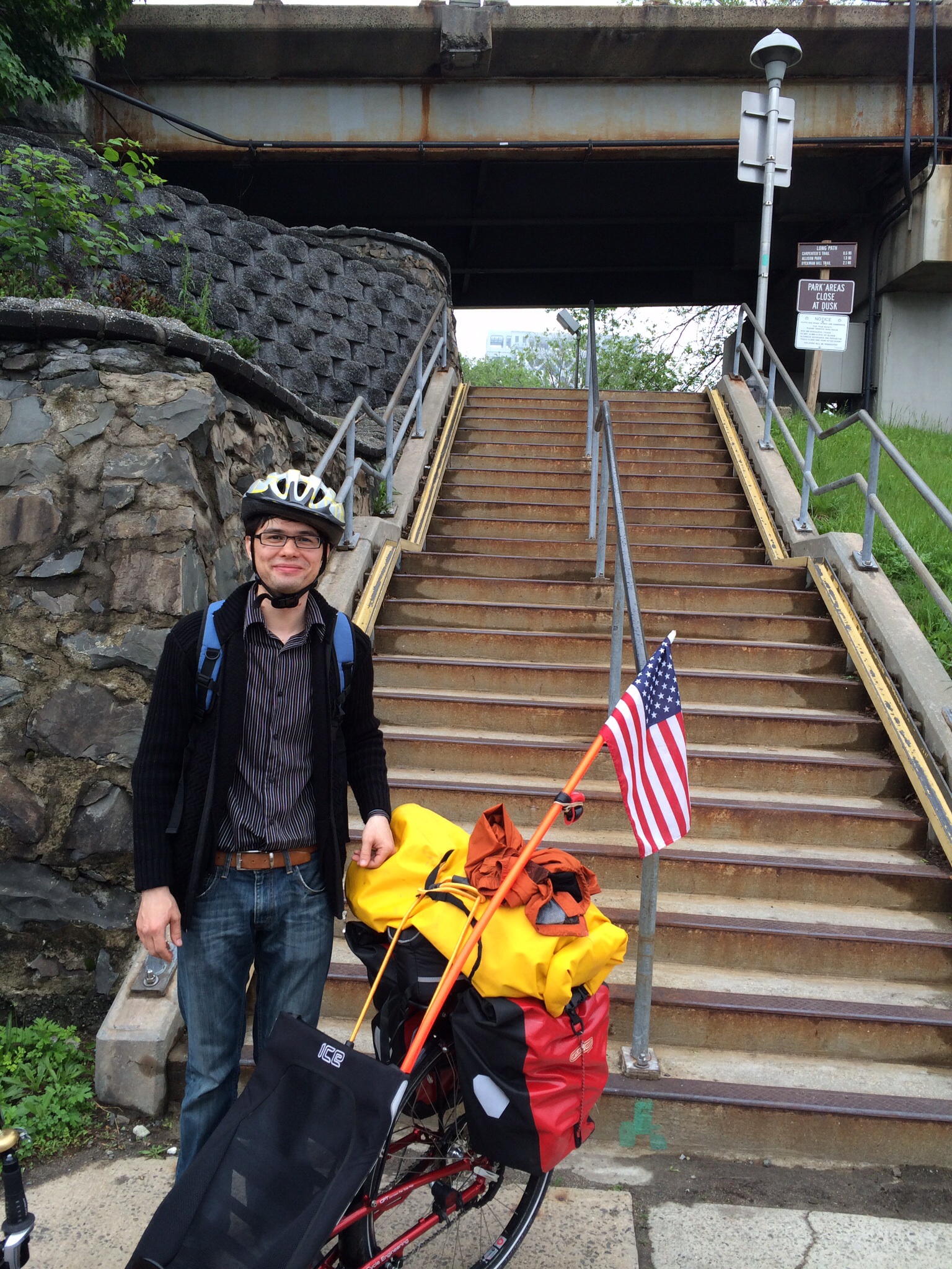 The intrepid Daler is standing at the foot of the least difficult set of stairs we encountered; after we took that photo, he biked back across the bridge and went to work, having spent precious hours this morning to see that we got to New Jersey safely.