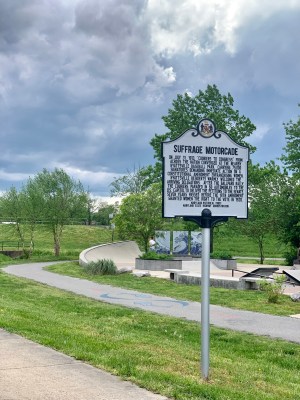 A 60-car motorcade gathered here in July 1913. Participants drove to the Senate with a petition for women’s suffeage bearing 75,000 signatures.