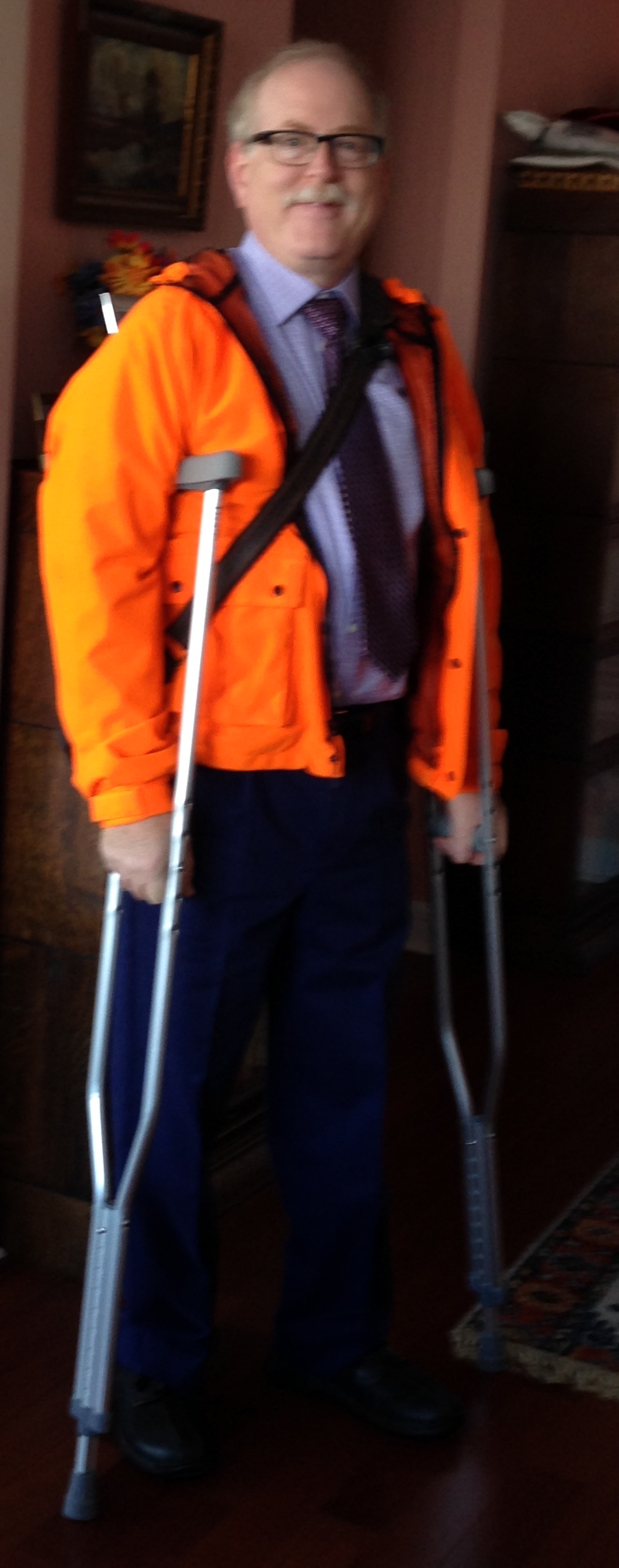 Here I am 3 weeks later in the jacket that, to the amazement of the police officer, the driver didn’t see. This crash was no “accident”: the driver chose to make an illegal turn and to look away from where she was going.
