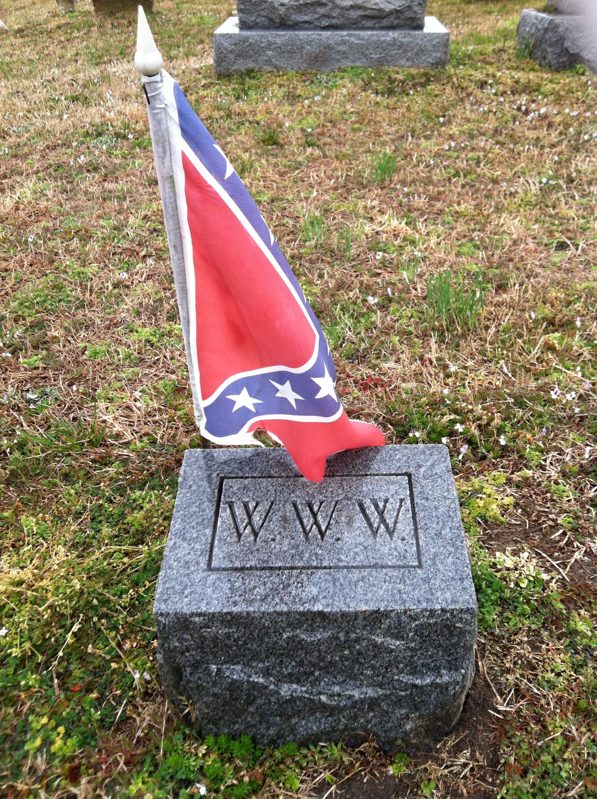 This flag – symbol of an oppressor that wanted the liberty to oppress some more – adorns a cemetery footstone just north of the VA-NC border. What does it say about Mr. W.W.W., his descendants or admirers?