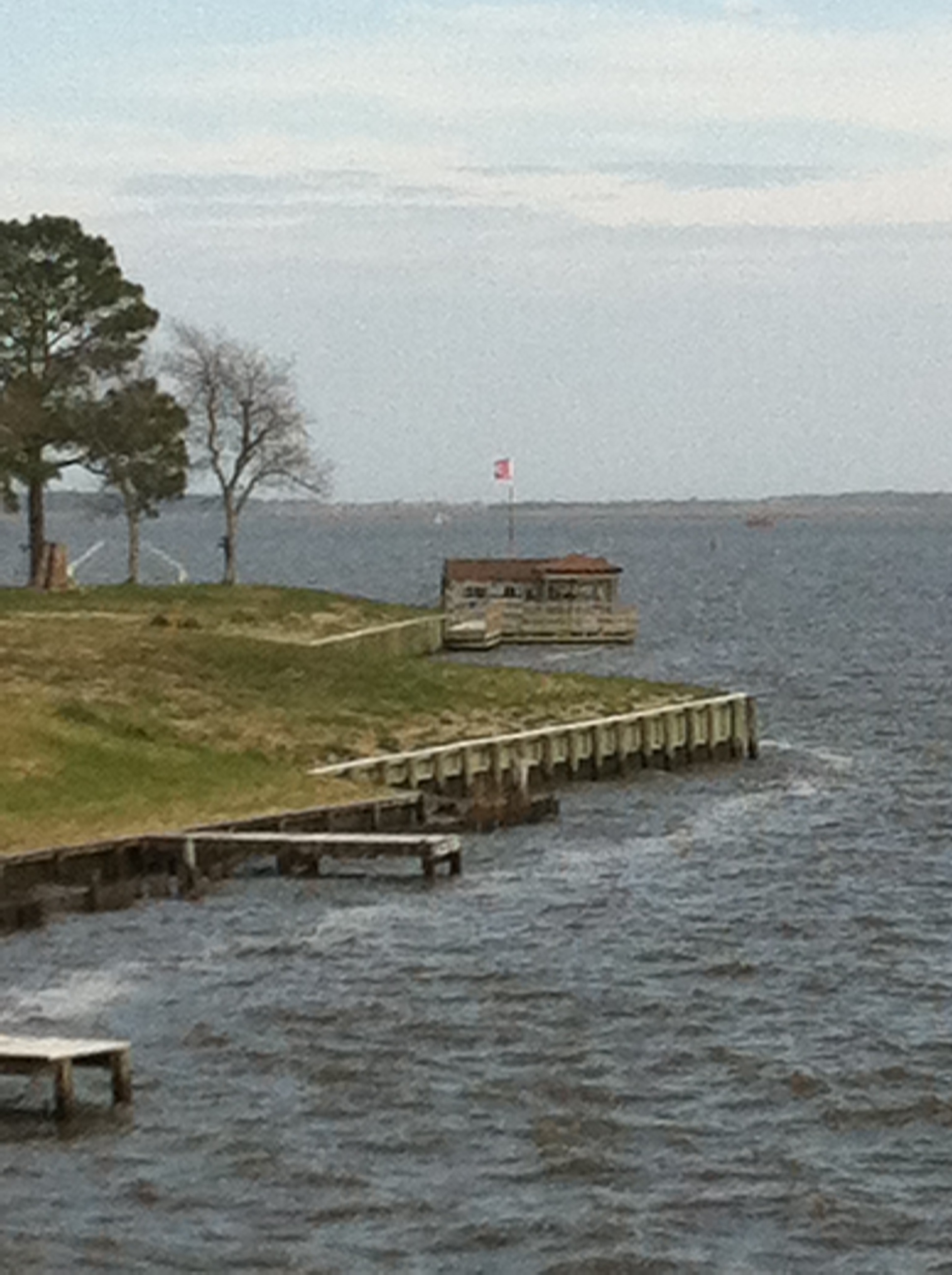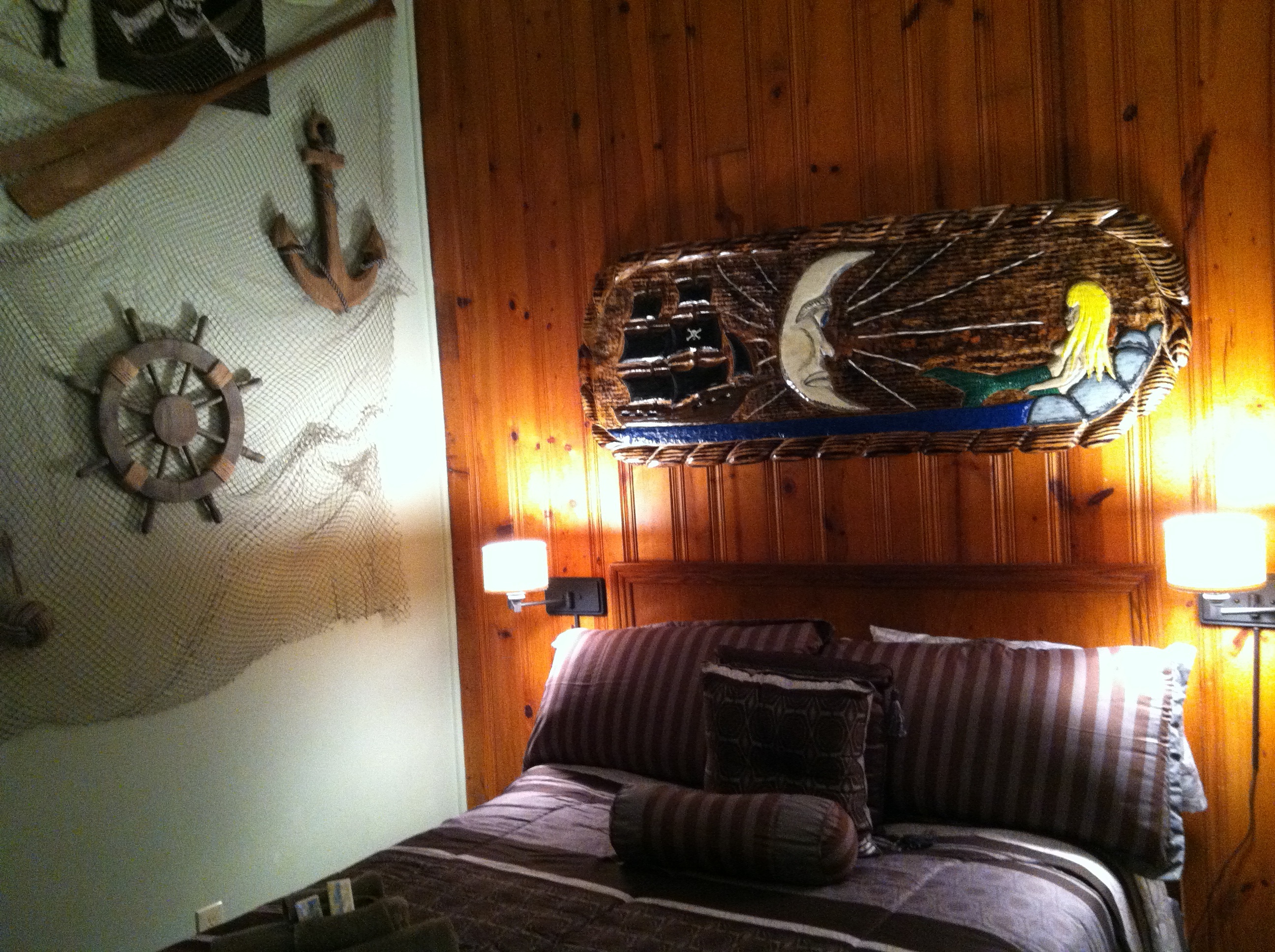 We landed in Currituck and headed south for the Outer Banks. But we burned a lot of daylight during the long ferry wait. Rain started, thunderstorms were predicted, and we would arrive at Kitty Hawk after dark. So we found Barry’s Walnut Island Lodge in Grandy and called it a day. Barry gave us a discount and we are the first to stay in the newly decorated Pirate Room!