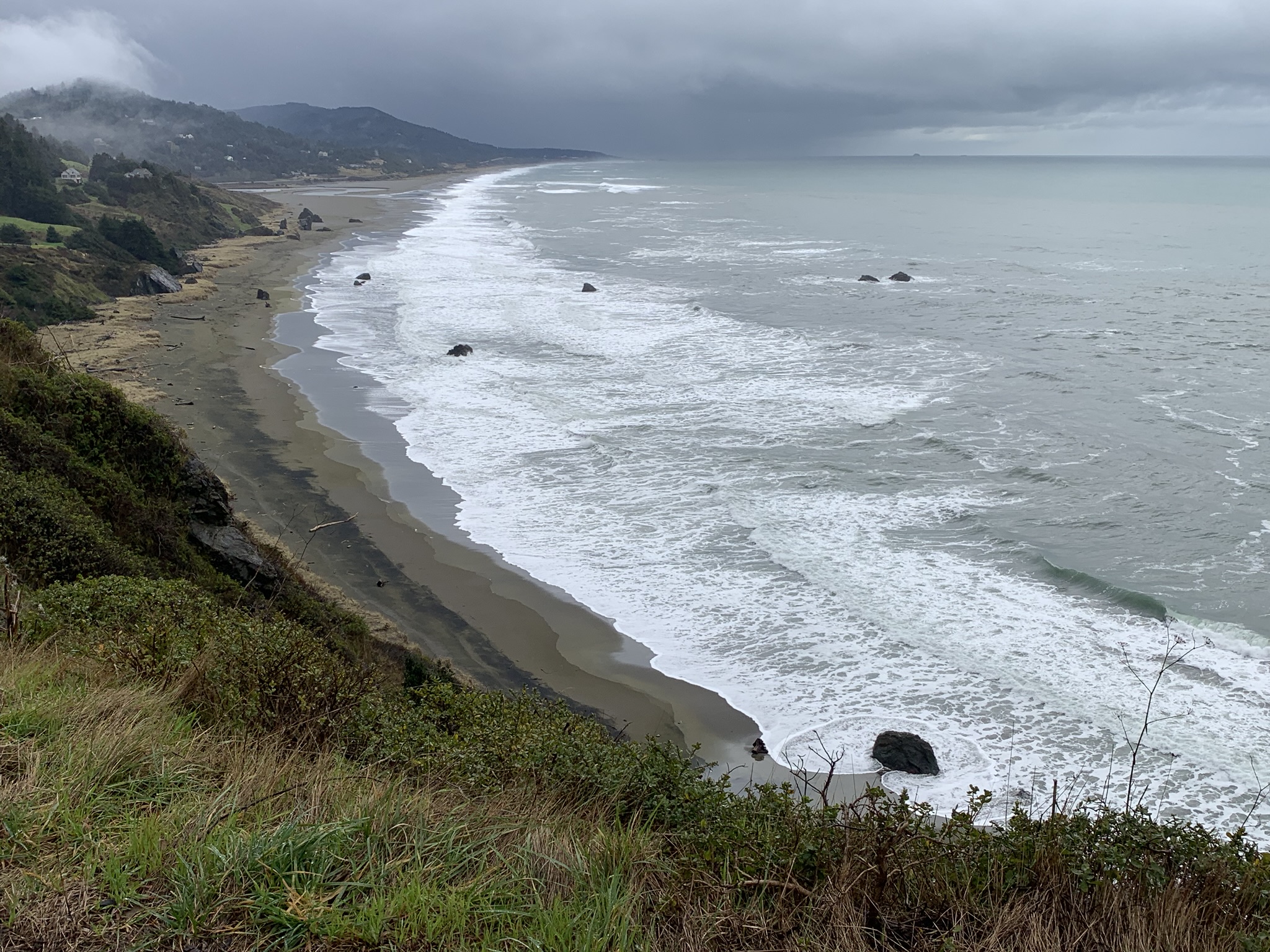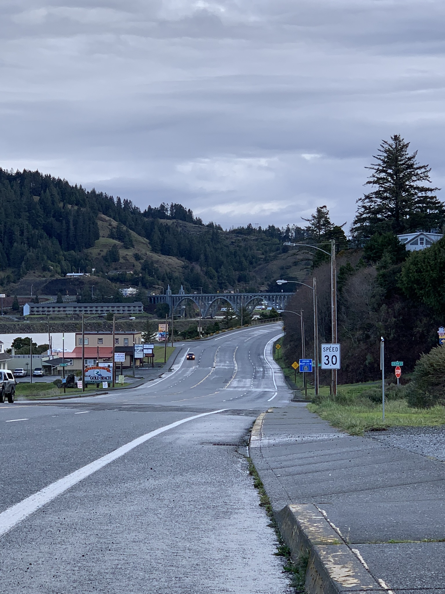 In the distance, the fancy bridge leading north from Gold Beach.