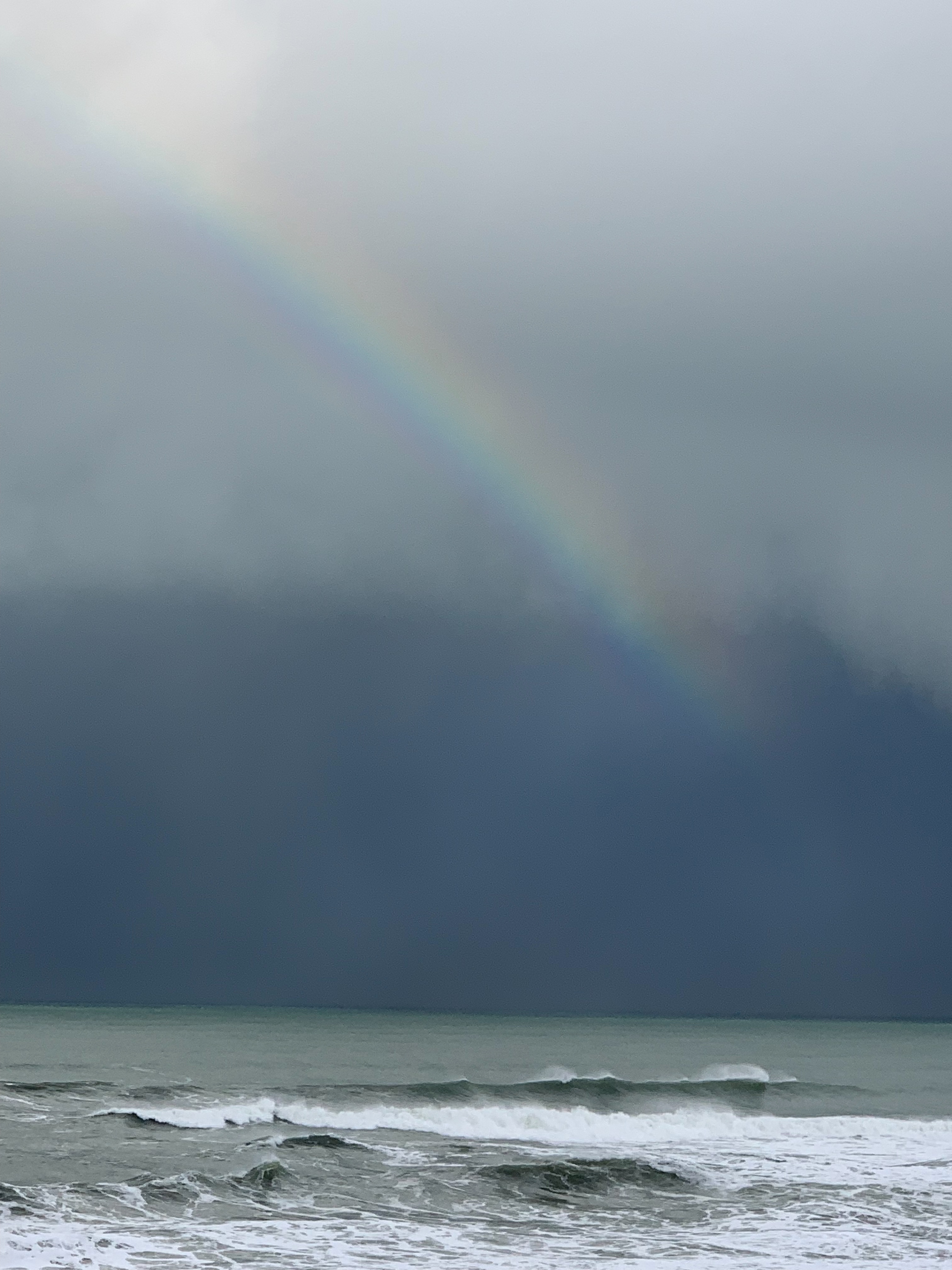 The rainbow over the Pacific lasted only a few minutes between downpours, migrating north before disappearing.