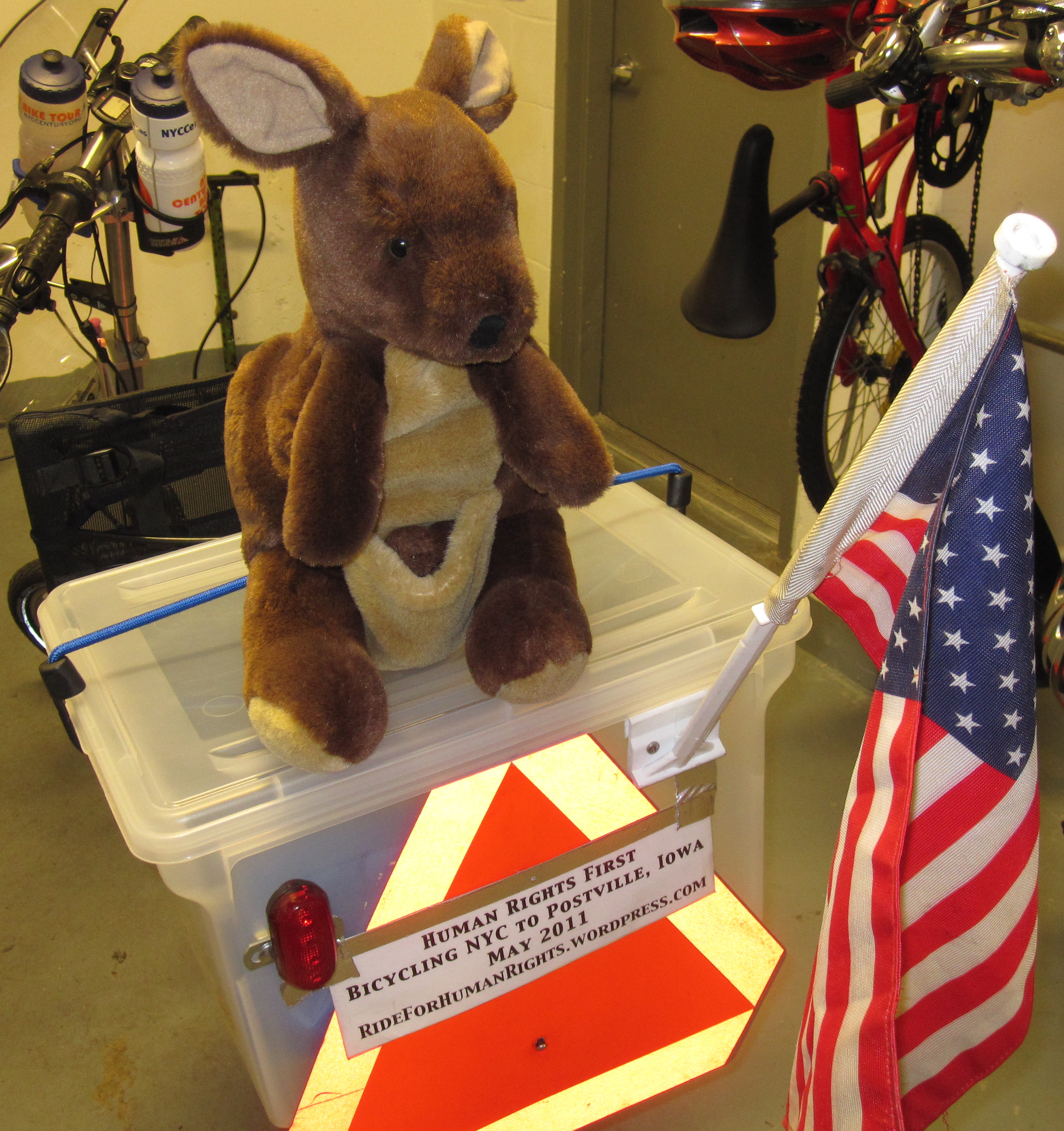 Here I am in our building’s bike room, atop our new cargo carrier. It’s a plastic file box with a snap-top lid. The box is a little smaller and lighter than a plastic crate. The smooth sides improve airflow, and it’s weatherproof. The box will sit behind Jeffrey, out of the wind.