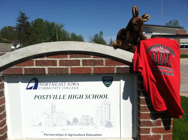 Here I am with a souvenir shirt from Postville High, announcing that “Character Counts”. We agree, and think that the kids of Postville prove it with their close-knit, accepting community.