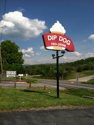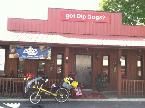 Here’s the Dip Dog ice cream stand on the Lee Memorial Highway. (This far south, Stonewall Jackson no longer is a highway name.) The Lightning attracted a lot of attention. Jeffrey had interesting conversations with several families, among them this woman with her boyfriend and son, and the Bartley brothers (standing by the Lightning) who’d just driven up from Nashville. Upon hearing the short version of the reason for the Ride and what HRF does, all acknowledged that the Ride is a worthy cause.