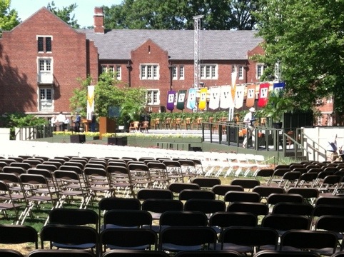 Chairs set up for graduation on the leafy Vanderbilt University campus.