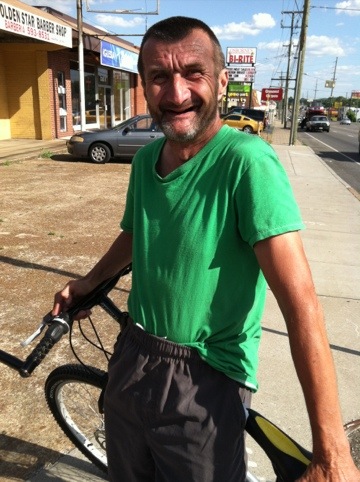 Mr. Flagg writes Gospel songs and humorous songs. He sang us one of the latter. A bicyclist himself, he was fascinated by the Lightning, and handed us a donation toward HRF’s work.